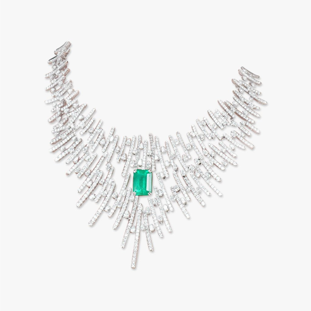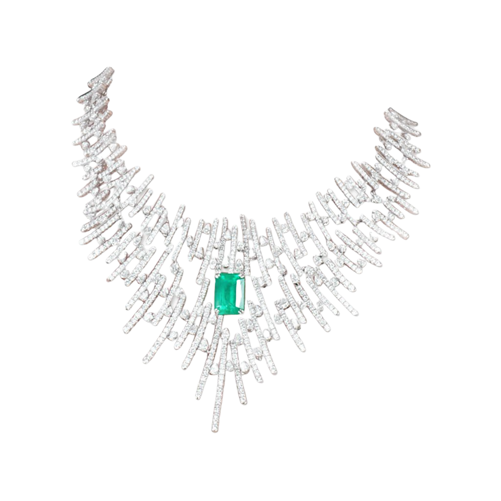 This modern emerald and diamond necklace is a part of the Devi Jewels Important Jewellery collection. This diamond necklace is an elaborate, custom made piece. The 15 carat Colombian emerald at its center, and meticulously hand crafted pear shaped diamonds set to float along the neck with no apparent attachment, this is an example of beautiful design fine craftsmanship and stunning elegance. The unparalleled beauty of this diamond necklace is second to none.