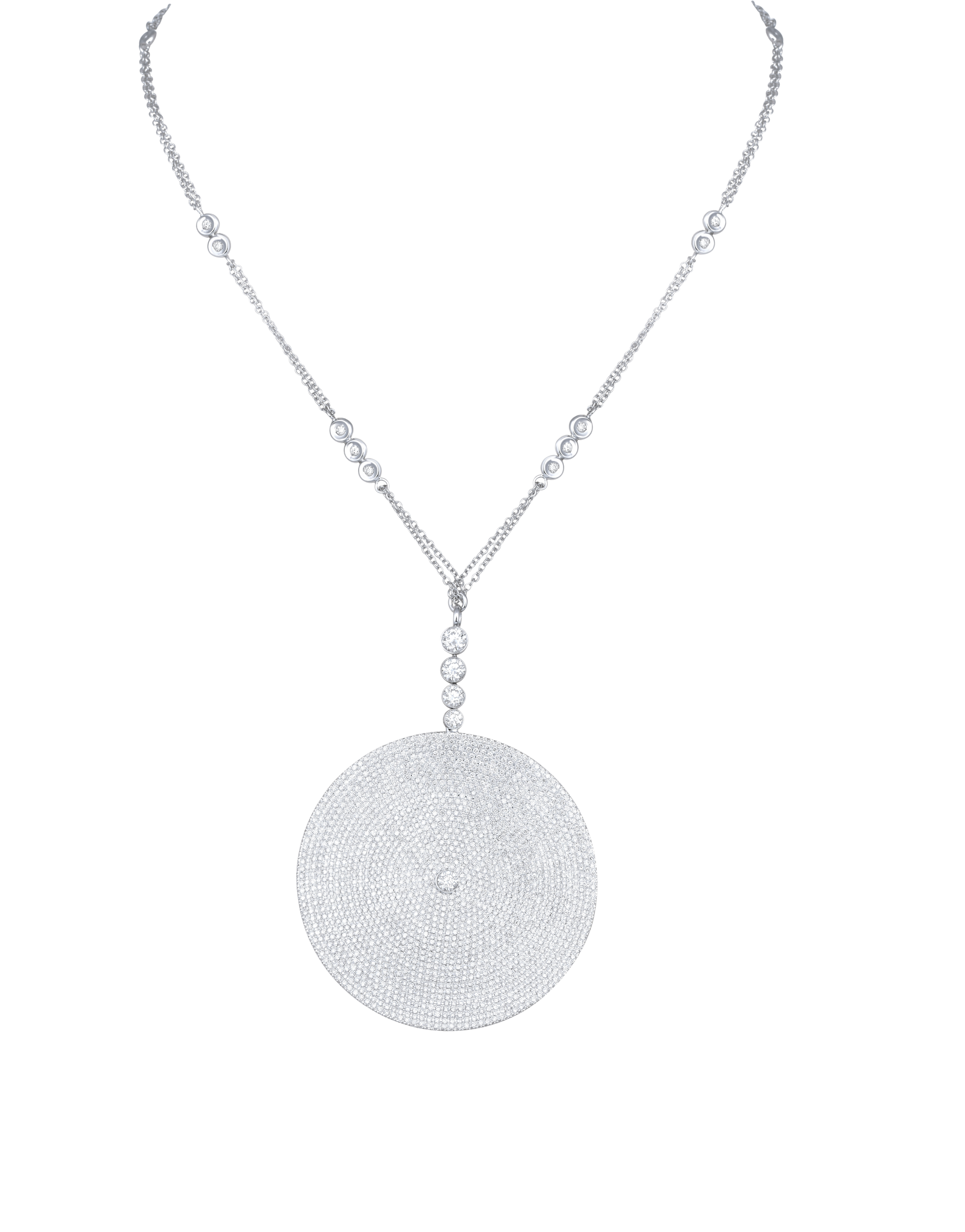 This large round circular diamond stud pendant representing eternity and infinity. The round shape with no beginning or end associated with wholeness and infinite continuity. Symbolising everlasting love and commitment. The sparkling diamonds bring light and energy to the wearer, in ancient time the round circle represents the sun moon and the circles of life.