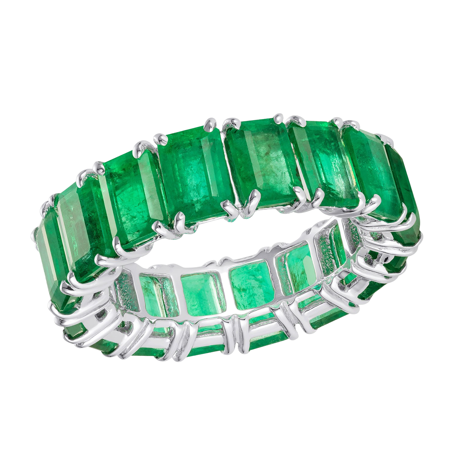 A classic eternity band adorned with 9.79 carats of rectangular Zambian emeralds set in 18 carat gold exuding the richness of the emerald green. This stackable emerald ring can be worn on its own or with multiple rings and has an unparalleled versatility.