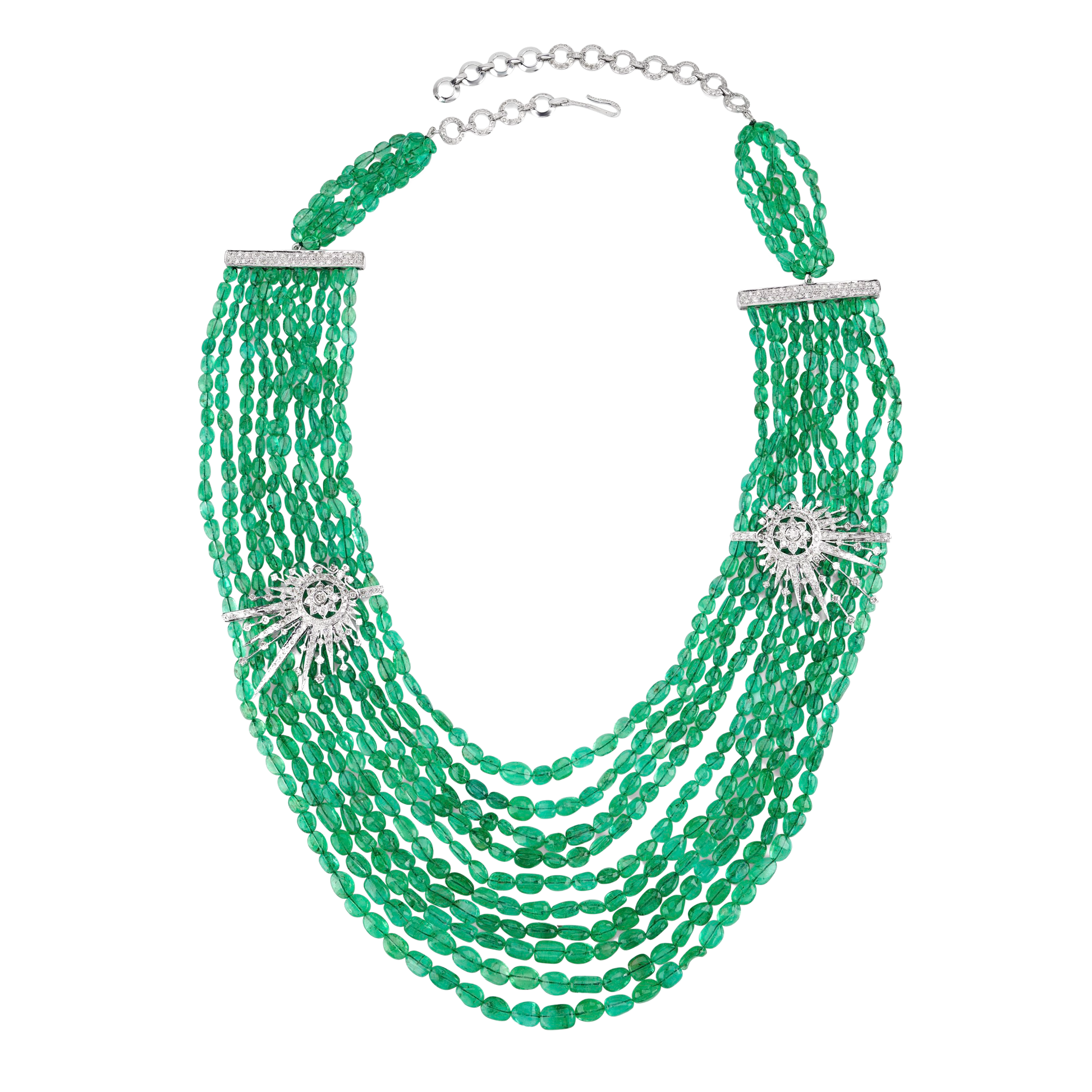 The Devi Jewels ode to the Maharani look. This Maharani, luxurious multi layered emerald bead necklace is another example of Devi Jewels' sustainable jewellery efforts. A pair of vintage diamond starburst earrings has been converted into a pair of brooches and strung from over 1000 carats of Zambian emerald beads. The finishing of the necklace from the back is of high quality with pave white diamonds.
