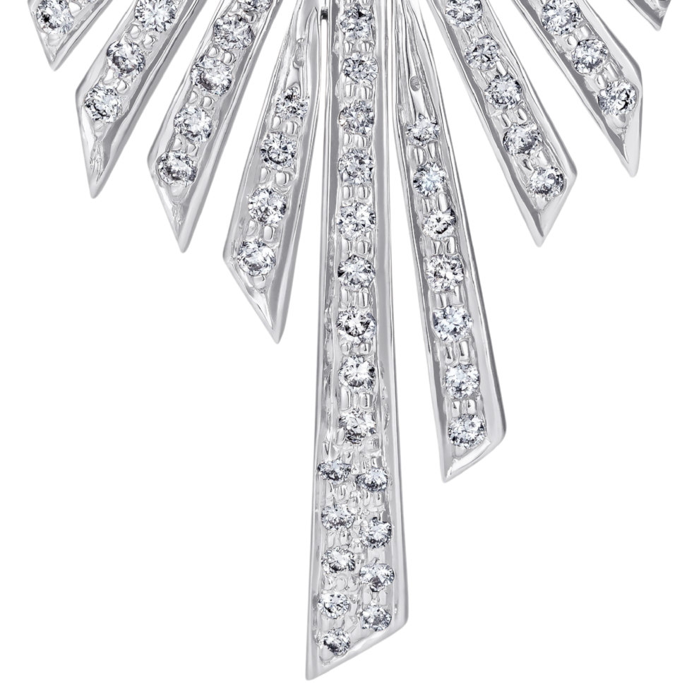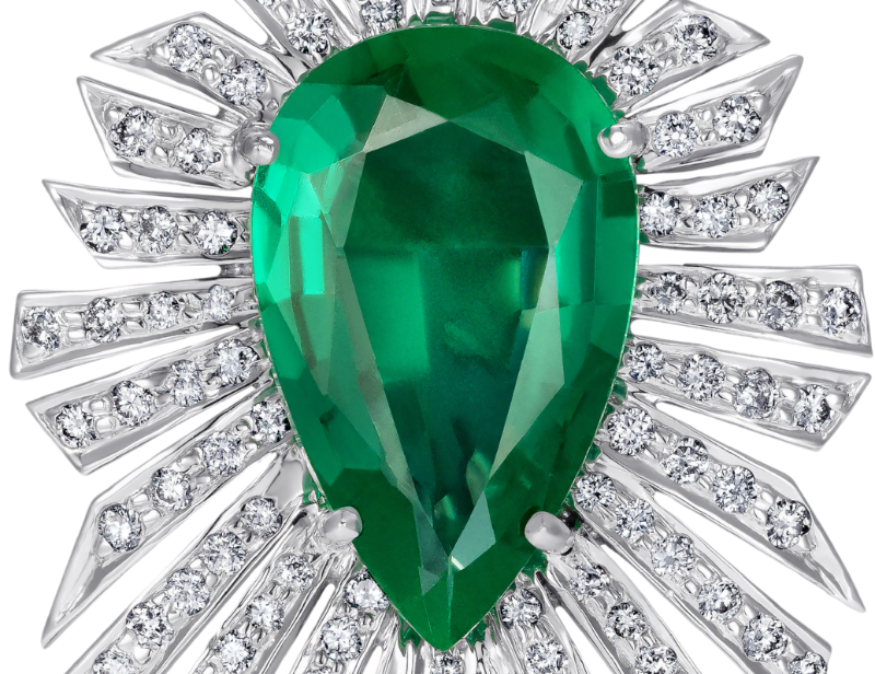 An emerald and diamond pair of earrings designed to be worn from day to night. Showcasing the starburst concept. The emerald green stone contrasting with white sparkling diamonds. Adding shine and sparkles to the wearer's face. A true example of modern design, fine craftsmanship and sophistication.