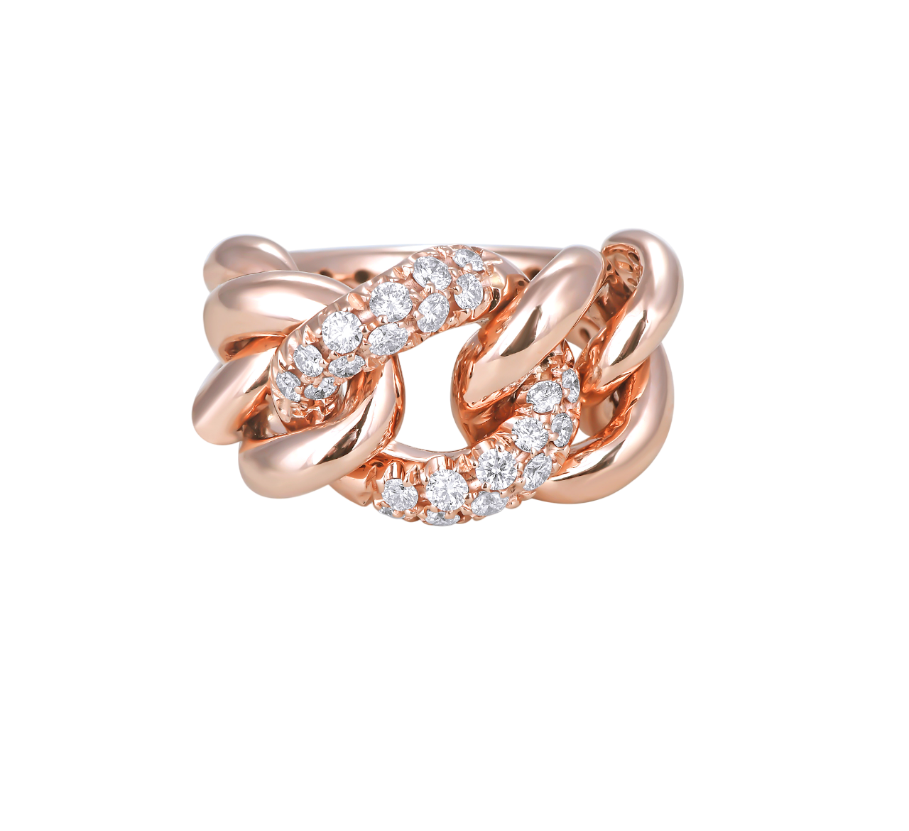This modern link ring captures the spirit of contemporary jewellery. Set in rose gold and illuminated with pave-set white diamonds, its clean lines and open structure highlight exceptional craftsmanship and everyday versatility. A chic addition to your ring stack or powerful enough to wear on its own.
