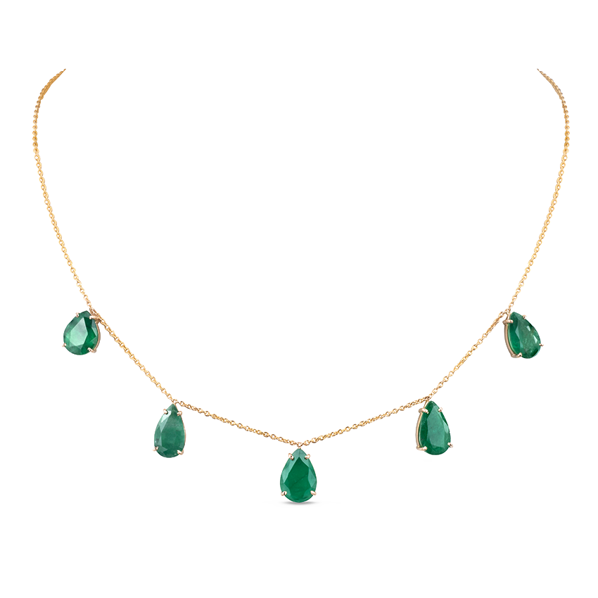 An interesting, eye-catching combination of yellow gold and oval emerald stones. A delicate gold chain as its base serves as a background to hang deep green hue of the oval emeralds. This can be worn as both casual and formal attire, adding a touch of luxury and colour to any outfit. This necklace is stunning blend of classic and modern style, making it a must for emerald lovers.