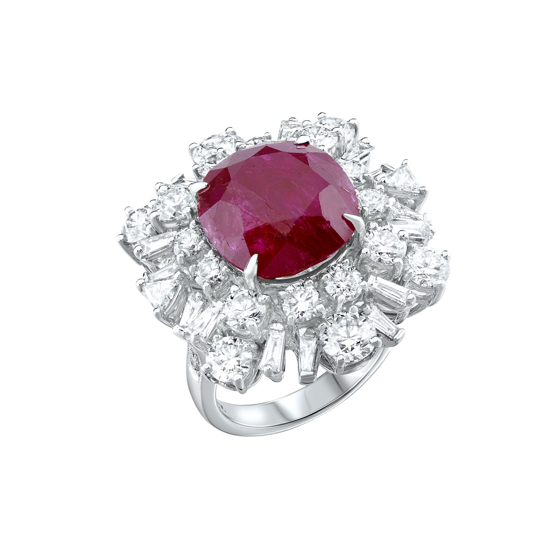 A part of the Devi Important jewel collection. A rare 15.31 ct Burmese unheated ruby, set with round, triangular and baguette diamonds of 7.03 cts. All in 18 carat gold.