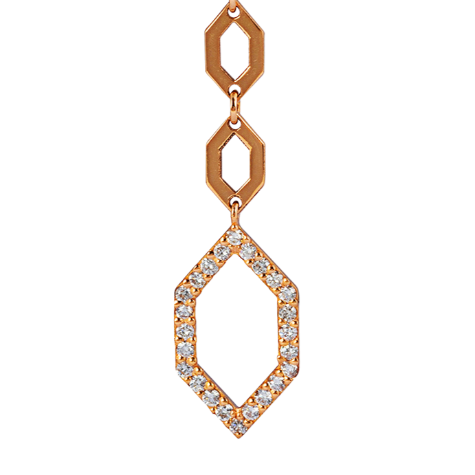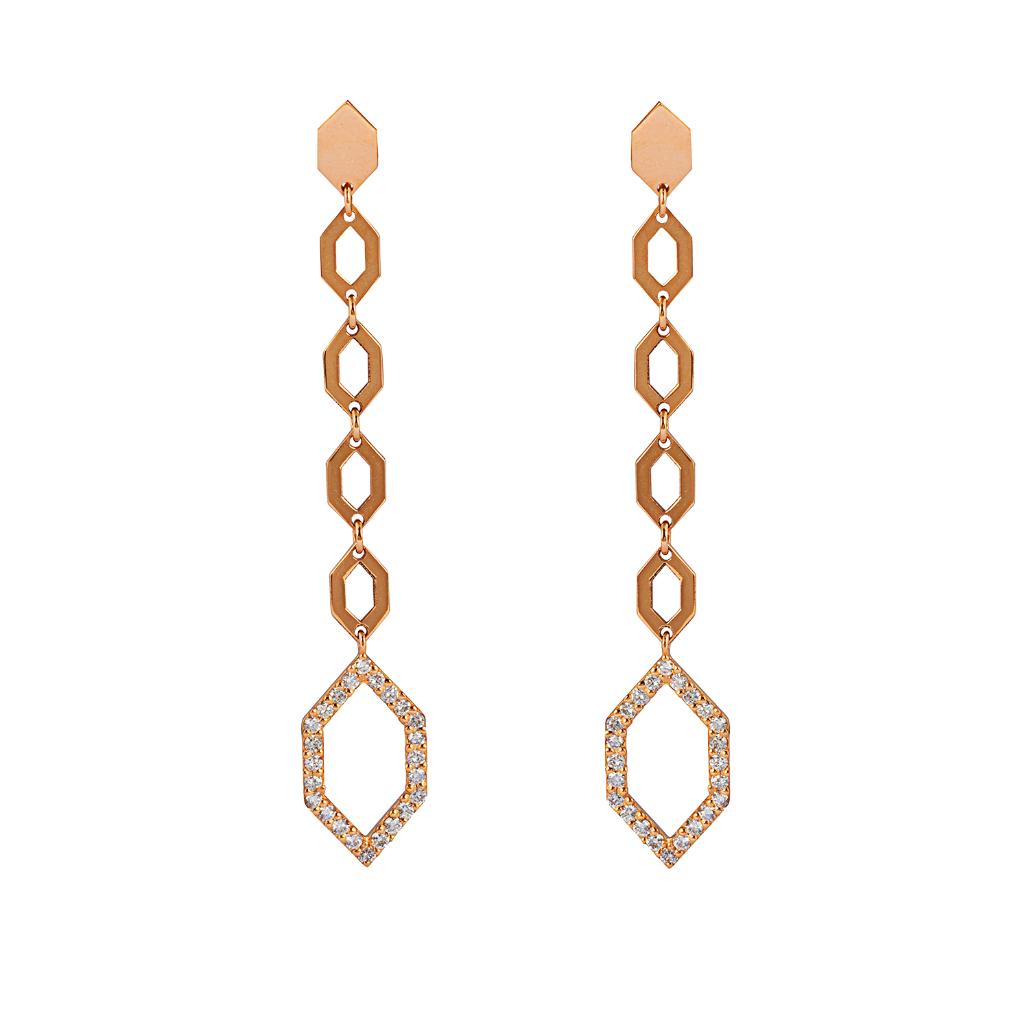 Designed to move with grace and catch the light, these long earrings combine soft 18 carat rose gold with 0.52 ct of dazzling white diamonds. With a gold weight of 5.10 gms, they illuminate the face with understated elegance, offering round-the-clock sophistication from morning to midnight.