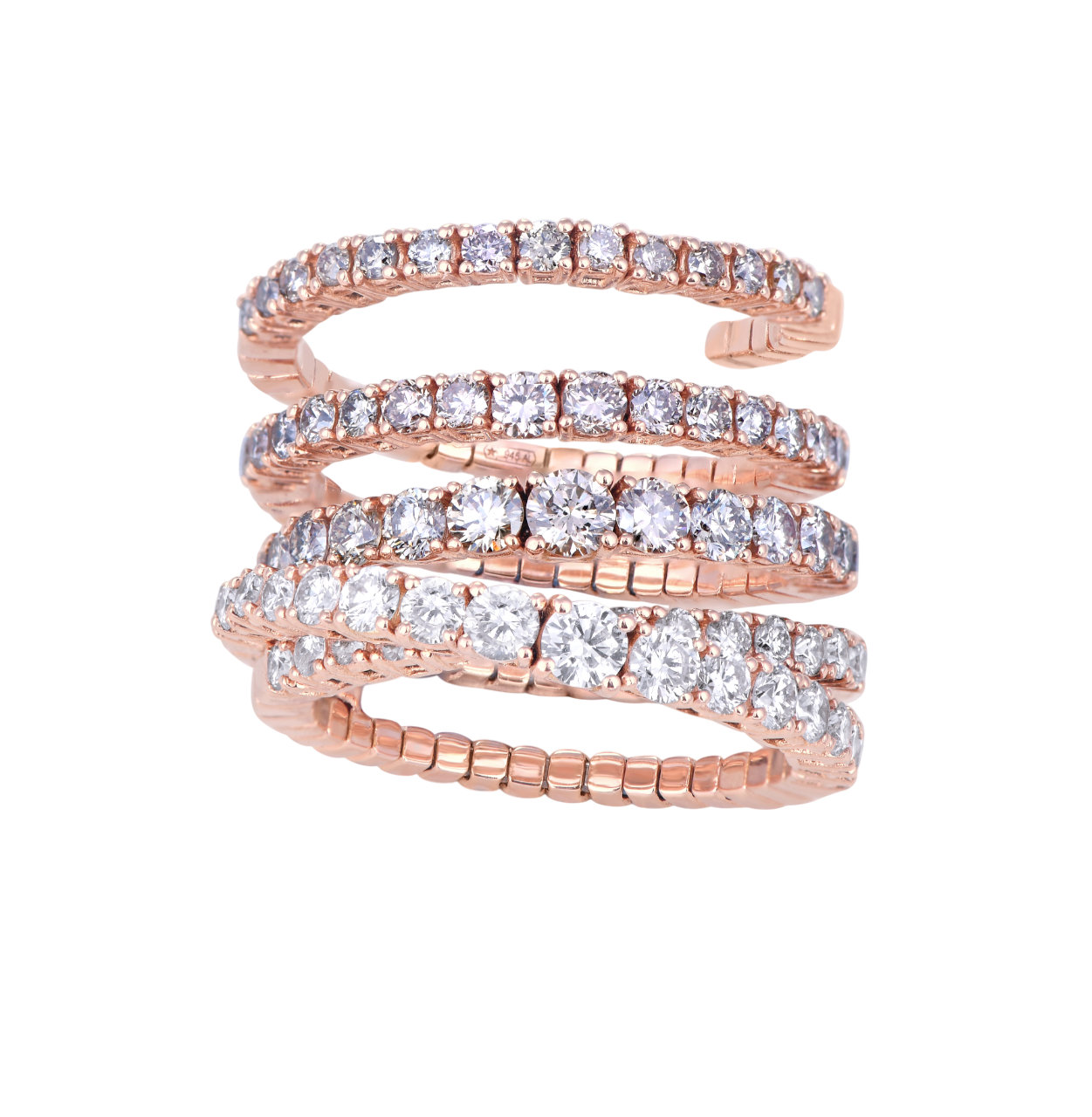 An example of fine craftsmanship using the technique of spring for this piece of jewellery to be able to coil around your finger made in rose gold using the combination of champagne and white sparkling diamonds. This piece of jewellery adorns the finger and is a testament to the finest craftsmanship that is the Devi Jewels brand value.