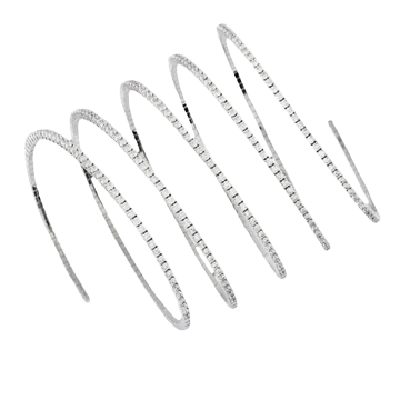 A feat of craftsmanship and modern design, this stretchable coil bracelet wraps around the wrist like a glittering ribbon of light. Crafted in 18 carat white gold with a gold weight of 31.49 gms, it features 5.46 cts of white diamonds set in a continuous pave. Flexible in form and fit, it moves with you and catches every flicker of light. Pair it with the matching coil ring for a statement that’s bold, sculptural and uniquely yours.
