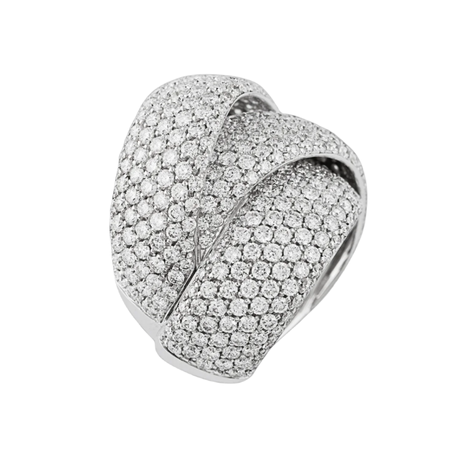 A bold and sculptural statement, this three-band turban ring is a testament to exceptional craftsmanship and design. Crafted in white gold and fully studded with 6.52 cts of brilliant white diamonds in seamless pave settings, it carries both presence and refinement.