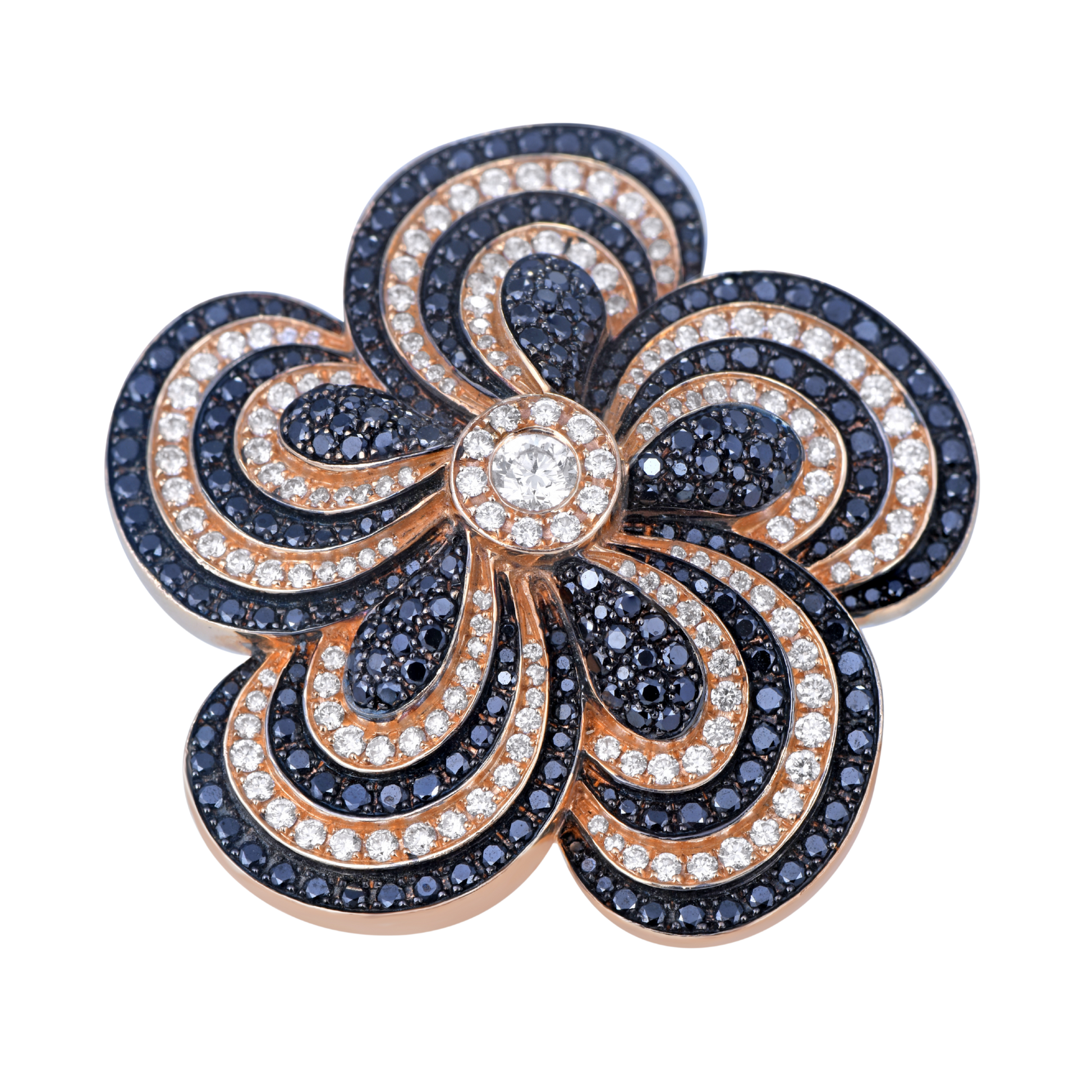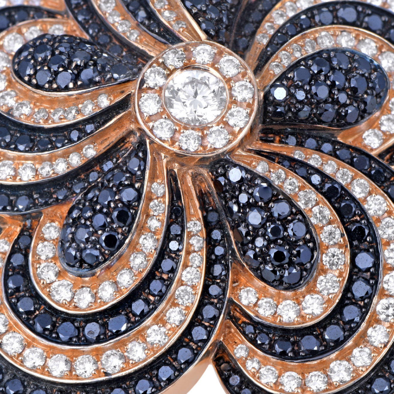 A dramatic, spectacular, showstopper piece of jewellery!! Choose this one-of-a-kind piece of jewellery to adorn your finger and make heads turn. The intensity of the combination of the white dazzling diamonds with the dark intensity of the black diamonds is a stunning interplay of gemstones set in rose gold. This jewellery piece is one of those pieces can be worn over years, over the years, always being in fashion, with great memories to cherish.