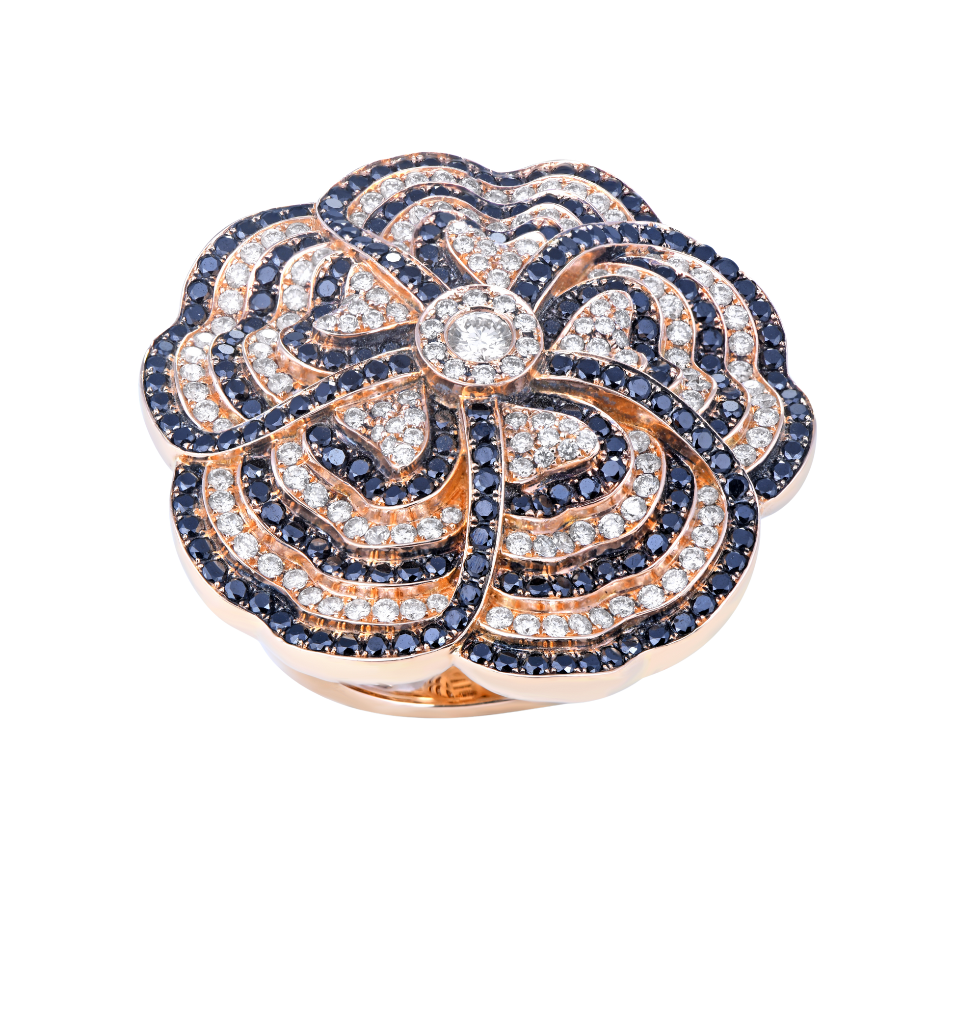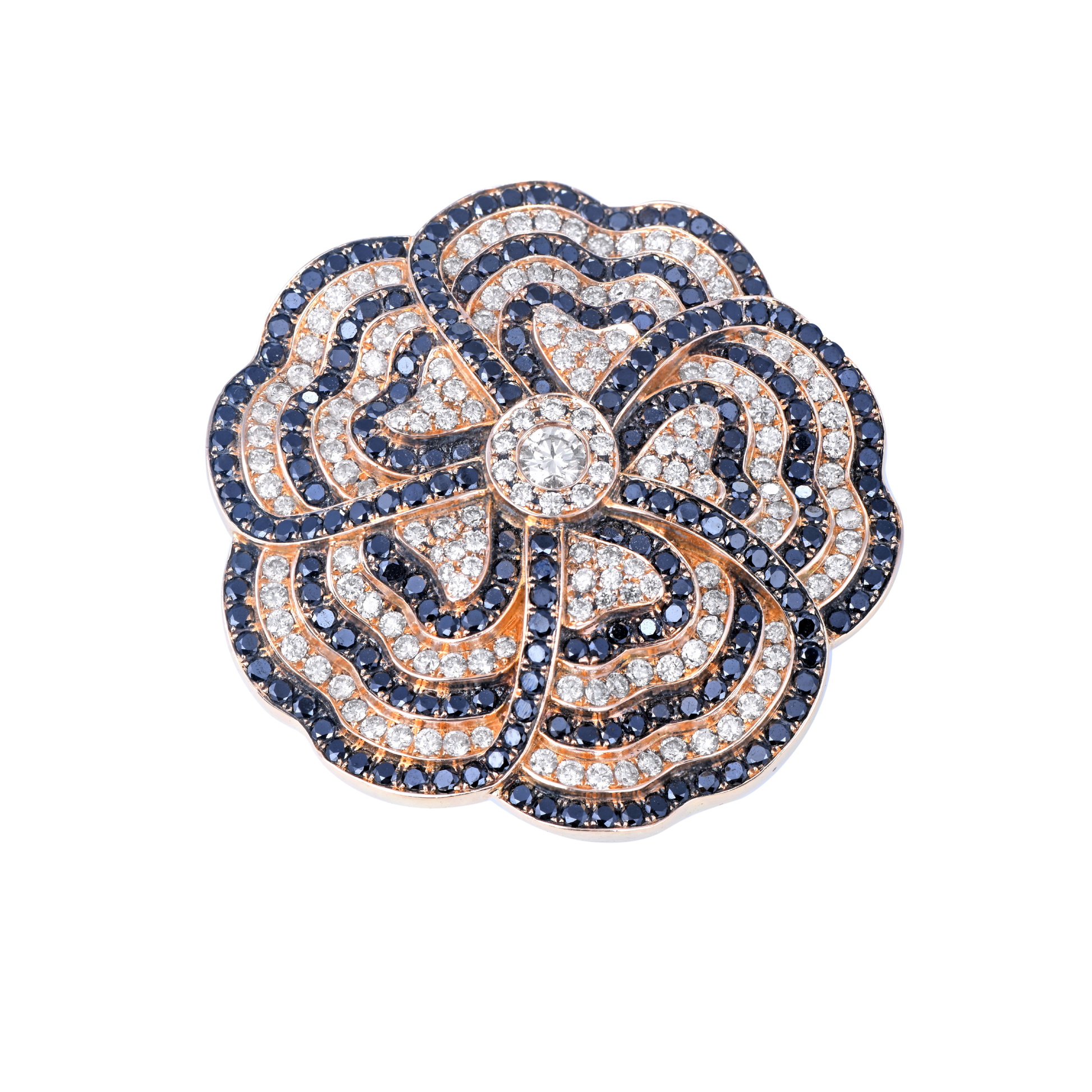 Inspired by nature and crafted with precision, this three-toned flower ring combines 18 carat rose gold, white diamonds and black diamonds for a striking visual contrast. The dynamic play of light and shadow adds depth and movement, showcasing the expertise of master artisans who create jewellery to be cherished for generations.