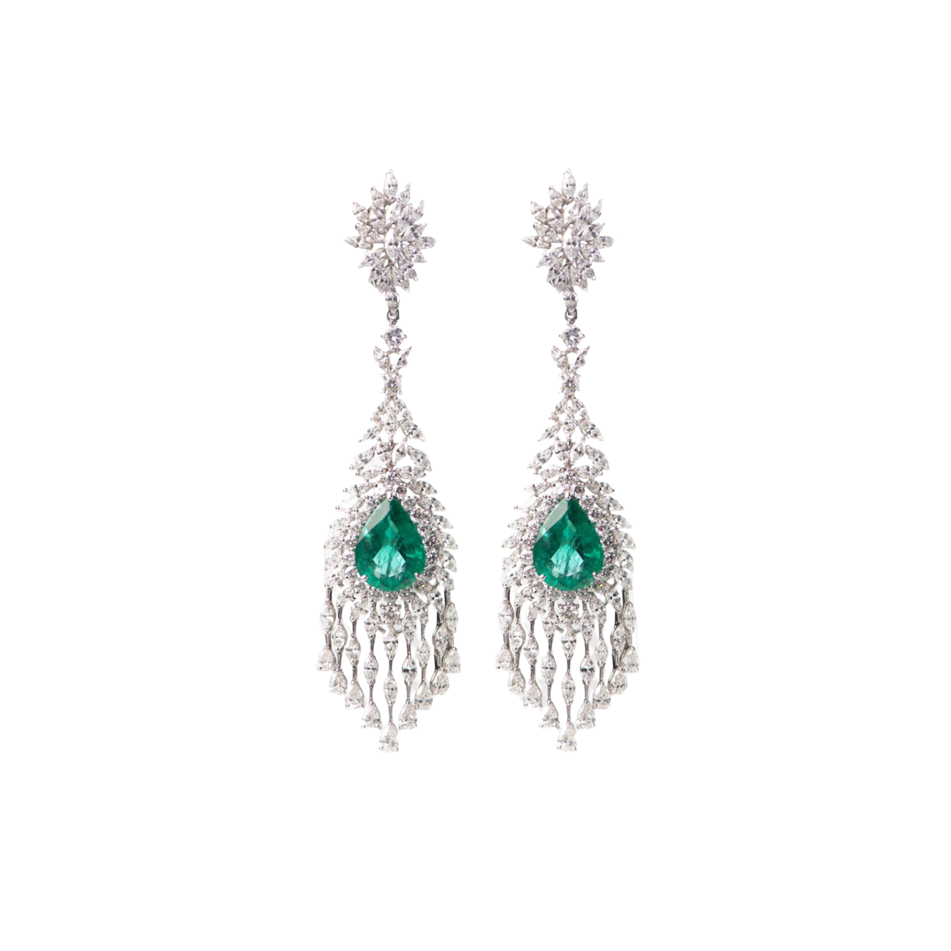 The gorgeous symphony of round, pear, and marquis diamonds play in perfect harmony to the 22.15 total carat Zambian emeralds. With inspiration from the intricate feathers of a peacock and the 20.55 total carat round, marquis, and pear shape diamonds giving the finishing touches to this shoulder-length pair, these diamond earrings are a red carpet look within themselves.